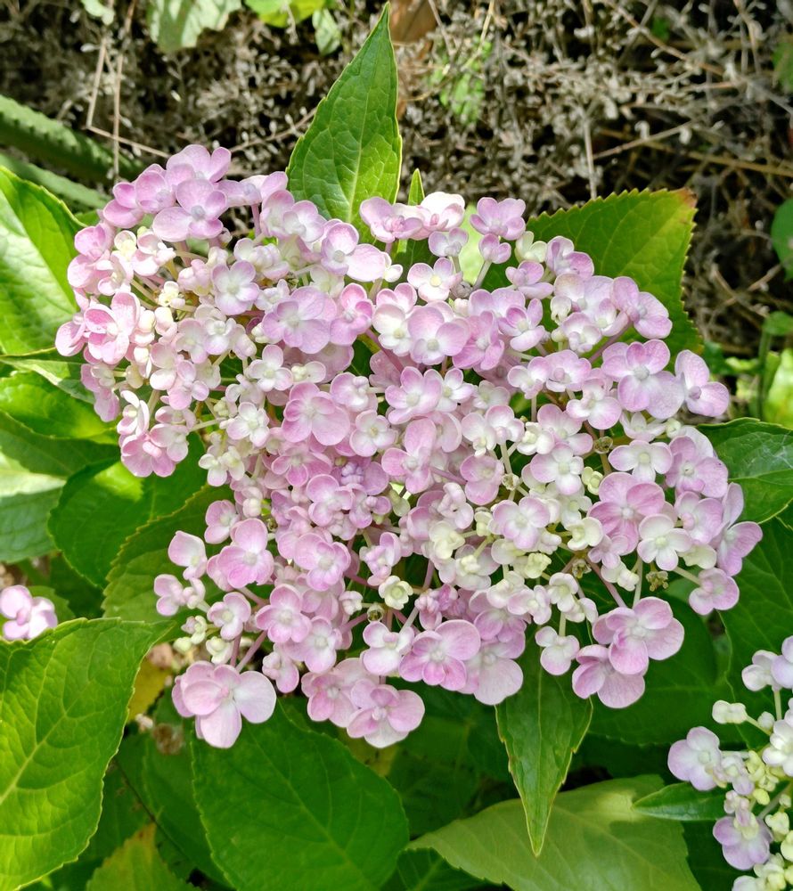ウズアジサイ(オタフクアジサイともよばれている)がうすピンク色で咲いています🩷