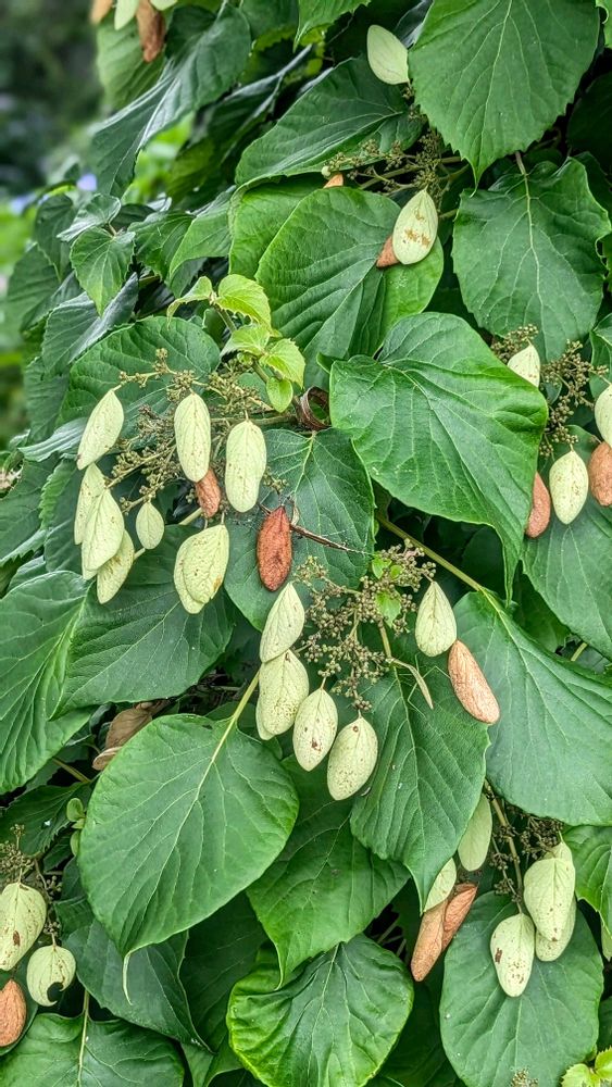 お寺の境内の大きな木に一面に這い上がったツタアジサイ。
