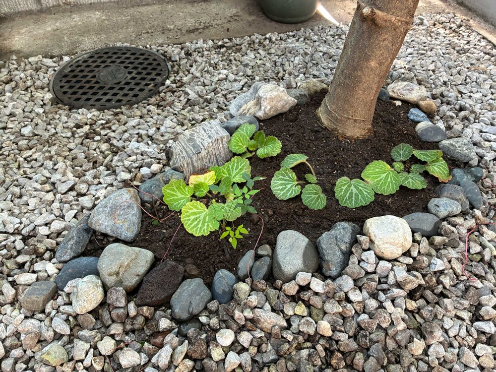 やつでの木の根元にユキノシタを植えた。根本の土を少し掘り返して、新しい土に入れ替えた。隙間の部分には来週手に入る斑入りのユキノシタを植える予定。
