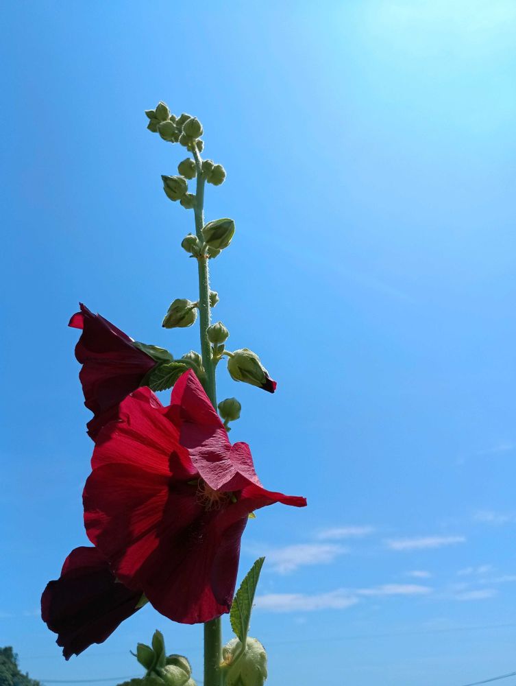 ウチのタチアオイは気まぐれで、花を挟んで上と下に蕾があります😓