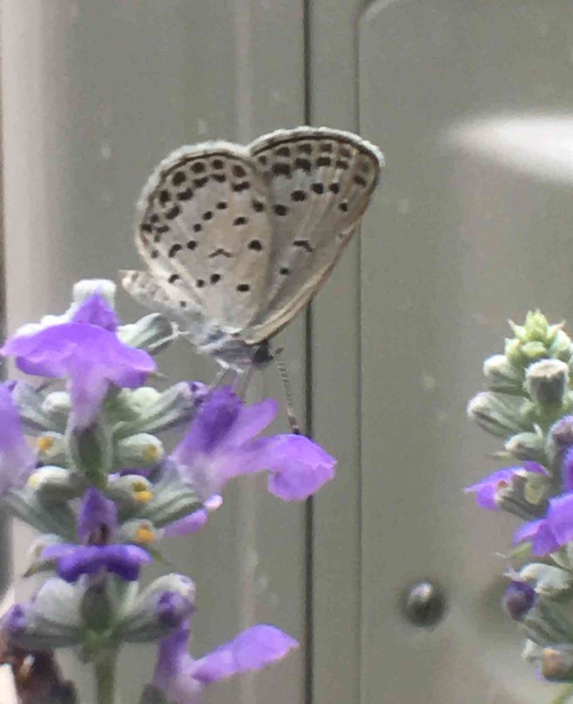 作業が終わって中に入ったら、いつもやって来る(たぶん)しじみちゃん🦋がブルーサルビアの所に