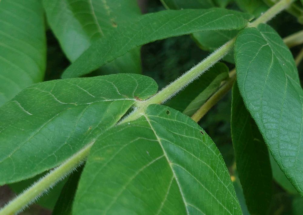 葉軸や葉柄には褐色の軟毛と、腺毛が密生する