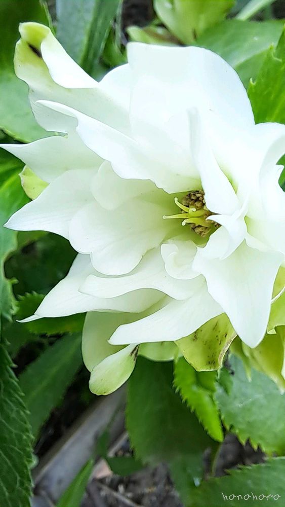 オバケみたいに大きくなった他のクリスマスローズの葉っぱの側、オバケ葉っぱが影を作ってくれるから大丈夫そうです( ᷇ᵕ ᷆ )