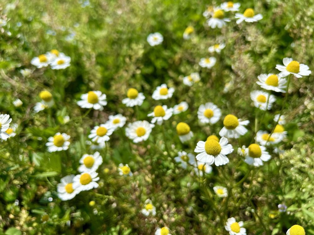 数年前に花壇いっぱいに咲いていたカモミールはこぼれ種で芝生のあちこちに広がっています。花の真ん中の🟡黄色のところがぷっくりしているのが好き(๑♡∀♡๑)