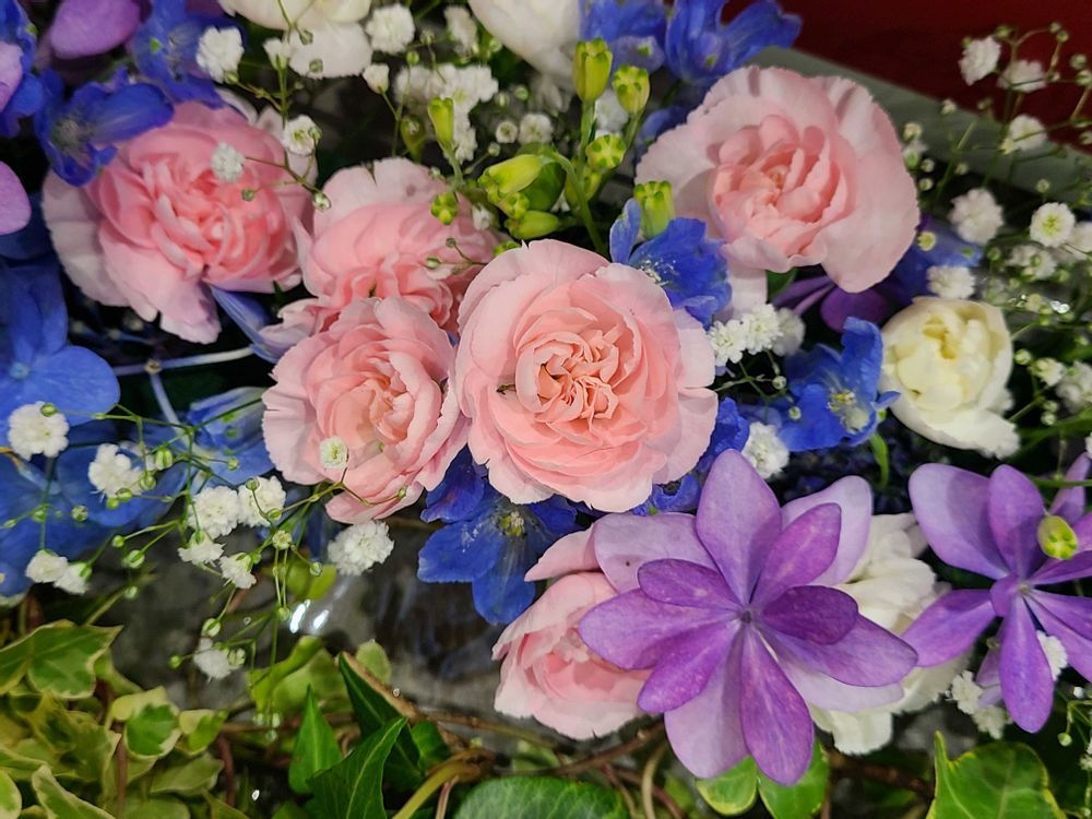 ピンクのカーネーションを主に 紫陽花、アイビー、かすみそう、チドリソウ?のコラージュがとても綺麗でした。