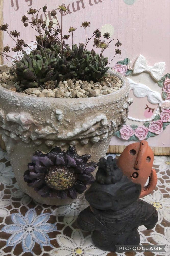 かおりんさんのリメ鉢🌻にいれてみました。写真でははっきりしませんが、黄色のお花で、ミニミニひまわりみたいです🌻