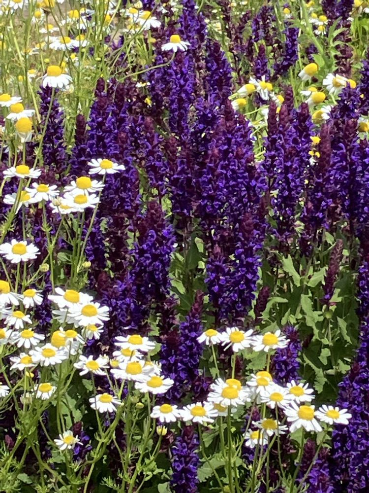 カモミール、ヒナゲシ、ニゲラ、キンミズヒキ、サルビアネモローサ、シロツリガネヤナギがキラキラ輝いて咲いていました。