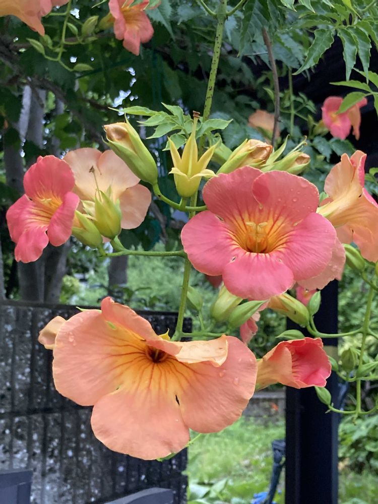 あちこちで華やかな色合いのノウゼンカズラが目立っています