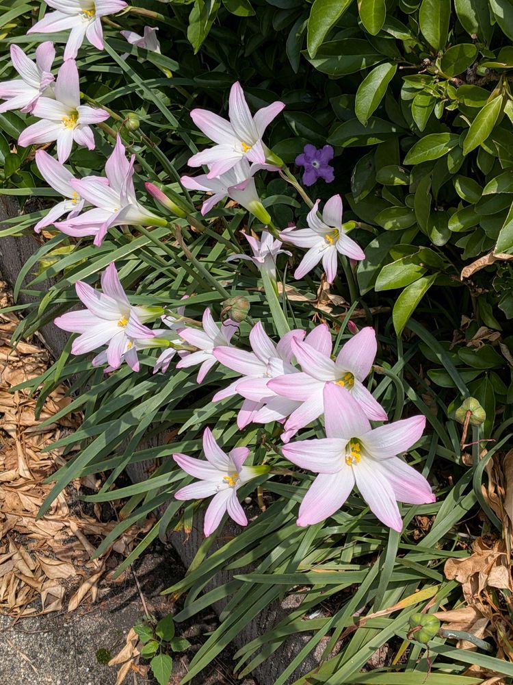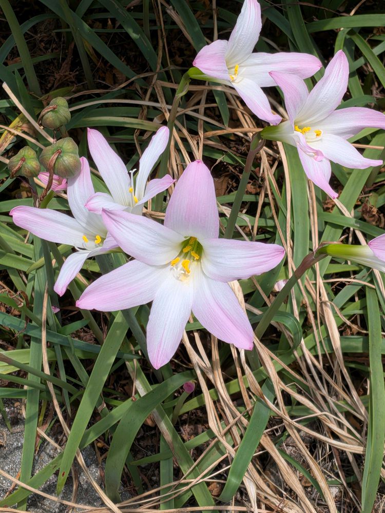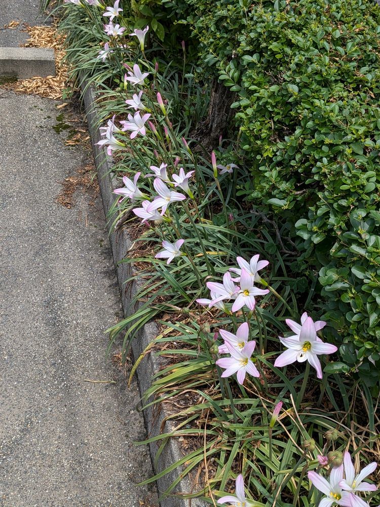 歯科の駐車場のレインリリー、ご近所から貰って、うちも咲いています。よく増えますね。