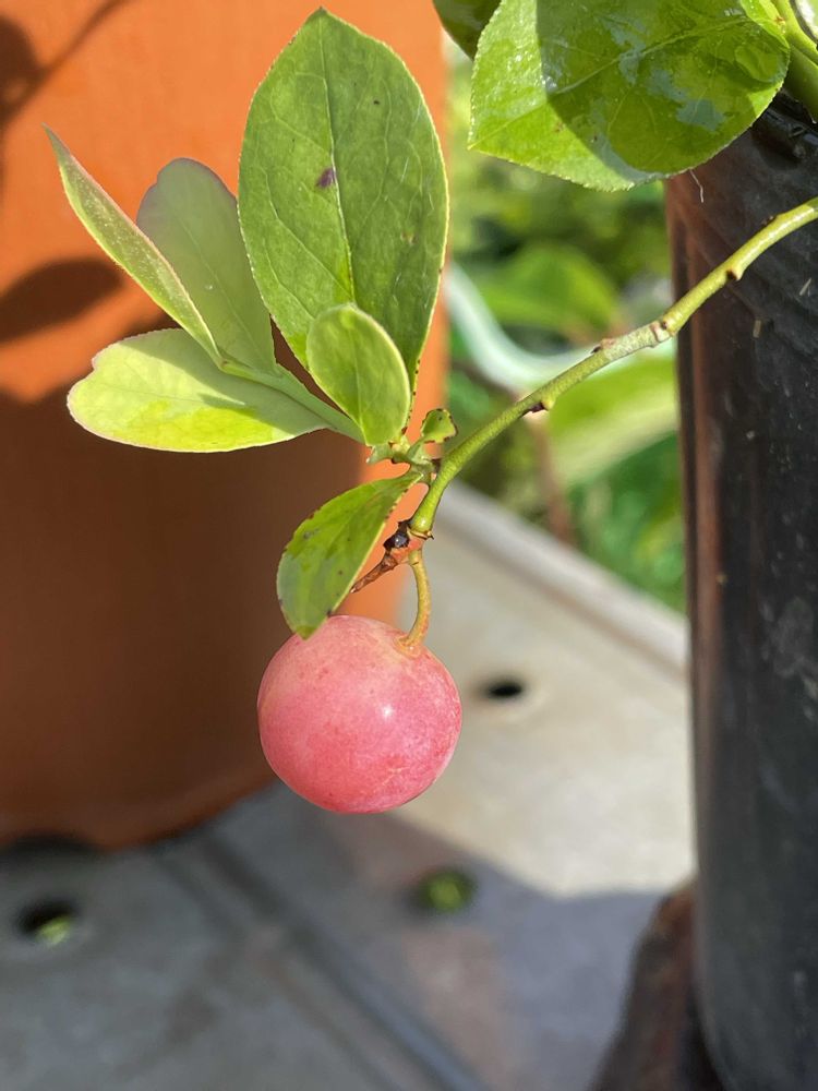 春に貰ったピンクのブルーベリー🫐花が咲いたの気付かずに今朝、一個だけ実を発見しました😆