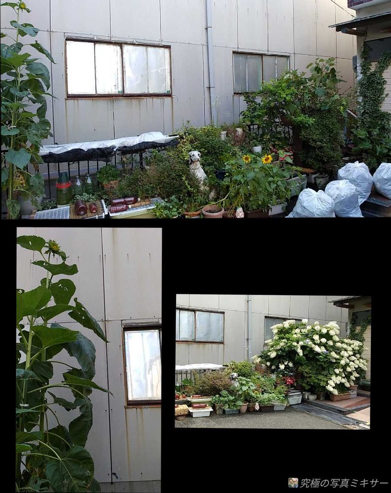 ⬆️ 綺麗に片付けた柏葉あじさい ↙️3メートル越えの巨大ひまわり🌻 蕾が見えます👀‼️ ↘️満開だった頃の柏葉あじさい ps, 柏葉あじさい片付けて、ゴミ袋 四つ 👀‼️ かなり疲れました…😮💨