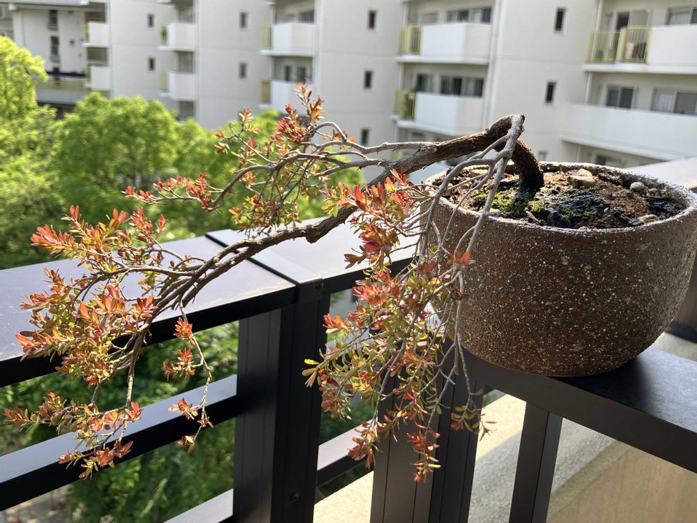 レプトスペルマム バーチカルドロップ盆栽風。枝の流れがお気に入り。なぜこの季節に葉が赤っぽいのかは不明…