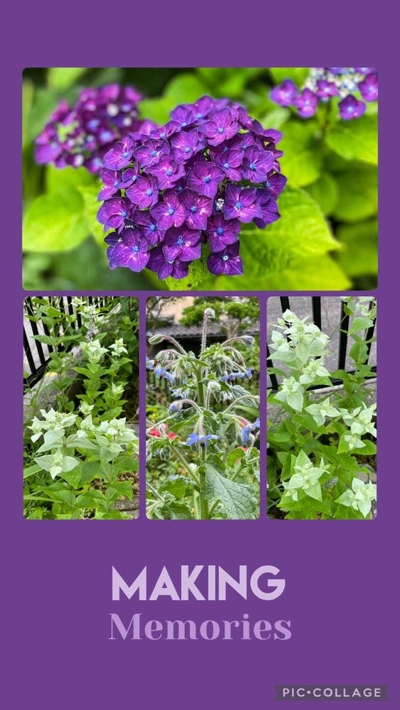 大好きな濃い紫のあじさいと涼しい色の広葉マウンテンミント、こぼれ種からのボリジ。めっちゃしっかりしてる