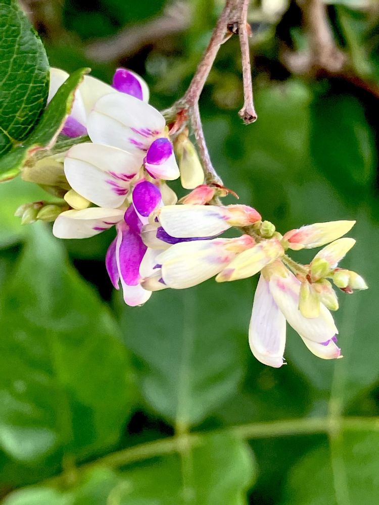花は淡い黄白色の蝶形花で旗弁や翼弁に濃い紫色の筋が入る!