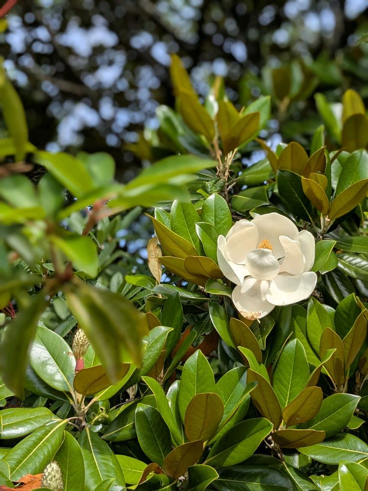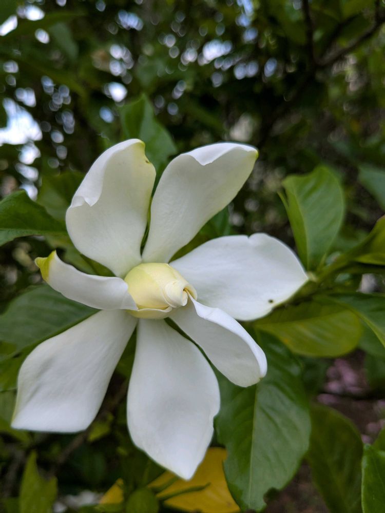 ③振り仰げはタイサンボクの大きい花、クチナシに似てる