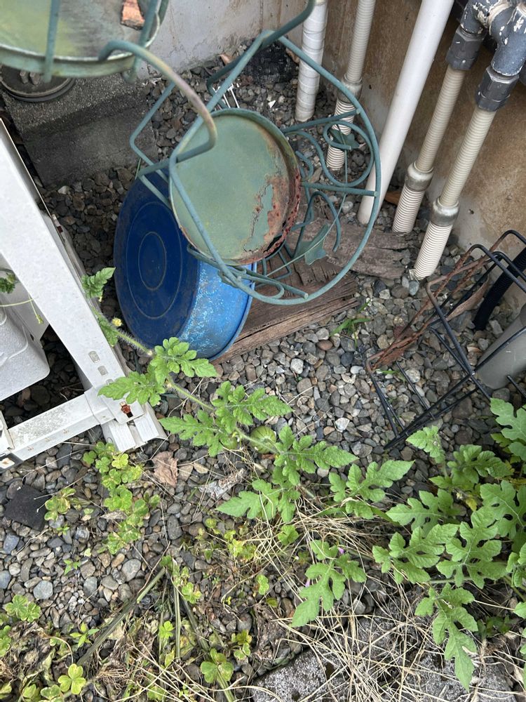 スーパーのフルーツパックの種と柚子の種を植えた植木鉢、雑草いっぱい生えてたので放置していたのですが、今日よく見たらスイカ🍉ができてました!!(この植木鉢は初投稿です)