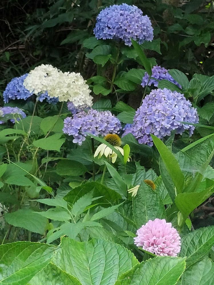 てまりてまりの紫陽花の手前にピンク色の花があるでしょ🌸