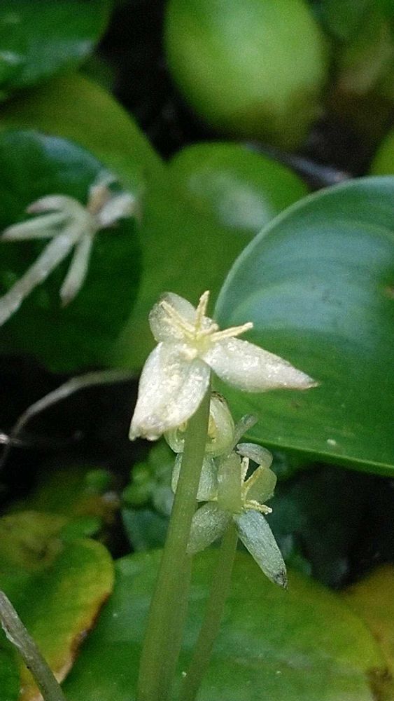 アマゾンフロッグピットの花が咲き始めました。水面を覆い尽くしてメダカが見えないので半分以上処分しました。