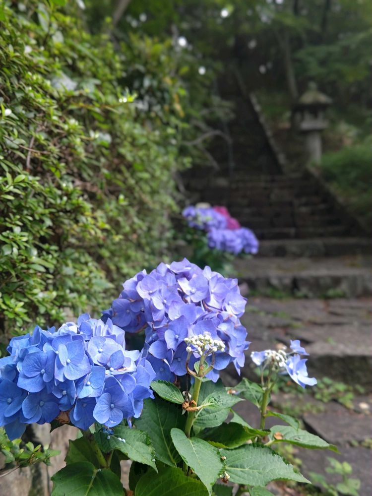 久安寺の階段近くの紫陽花たち。階段には、植木鉢に植えられた紫陽花が飾られてました。