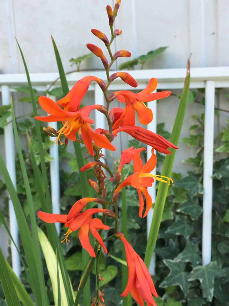 ビビットなオレンジ色の花と剣状の葉が特徴的なヒメヒオウギズイセン〈アヤメ科 耐寒性春植え球根〉が咲きました😊