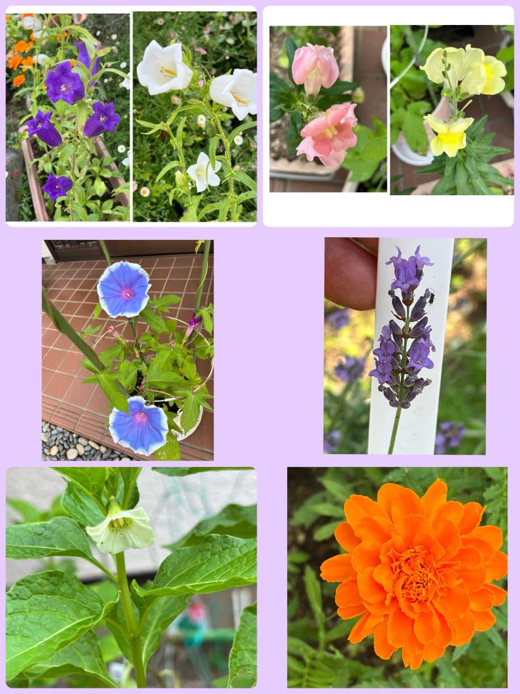 おはようございます。晴れ、28.2℃、10:30ムシっと暑い。庭に咲く花たち。つりがね草、642日目復活、また咲き出しました。金魚草8世ピンク/イエローの花が咲きました。垣根朝顔2世70日目2つ一度に咲きました。ラベンダー、たくさん咲いてます。ほおづき、また咲き出しました、今年の実の収穫は少ないようです。マリーゴールド4世100日目種採り中、まだたくさん咲いてます。金の成る木、今日から屋外へ、ずいぶん枯れていたので植え替え、挿し木もしました。😻😍🥰😋☺️😸