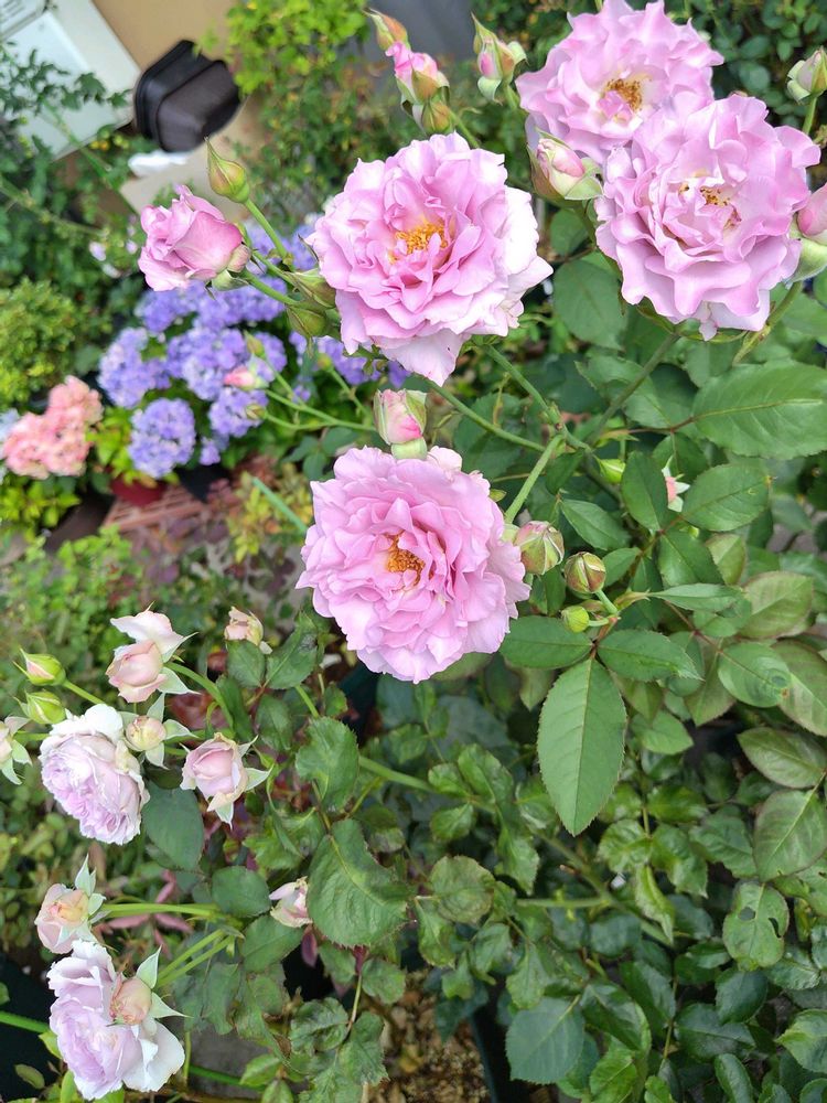 アパートの専用庭で、四季咲きバラをメインに約60鉢育てています。紫・白・桃色中心に集めて、香りが気に入ったり出先で一目惚れした植物たちです!