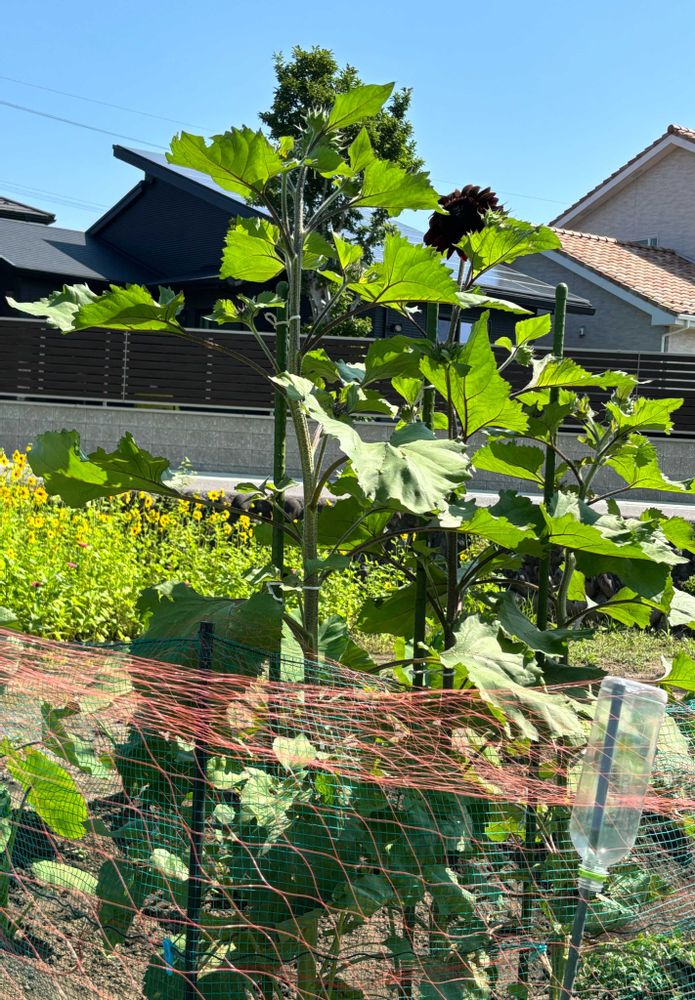 ⑴ 畑で赤い(茶色い)ひまわりが咲き出しました🌻先月小さな苗を3本買って畑に植えたらスクスク育ってこんなに大きくなりました❤(◕‿◕✿)