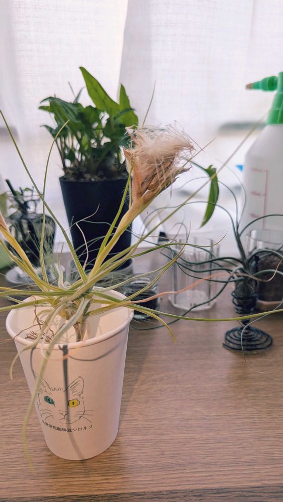 5年くらい前に咲いたエアプランツの花をほったらかしにしてたら、突然はじけました。タンポポみたいな綿毛のついた種が飛び散ってます。