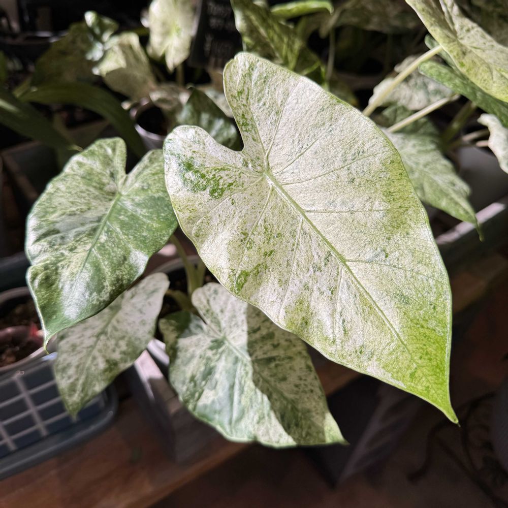 2025.8月に某サイトで購入した【アロカシア チャイ】の 突然変異?なんだろう 購入時、元々有った葉を(1枚目の葉)として、 下から新たな葉が出てきてる状態で到着しました(2枚目の葉) こちらに来て初めて出てきた葉に異変が。。 育て始めて出てきた初めての3枚目、4枚目 (途中から、斑1、斑2、、と続きます) どこまでこの謎の斑入葉が続くのか、 いや止まるのか……記録していきます