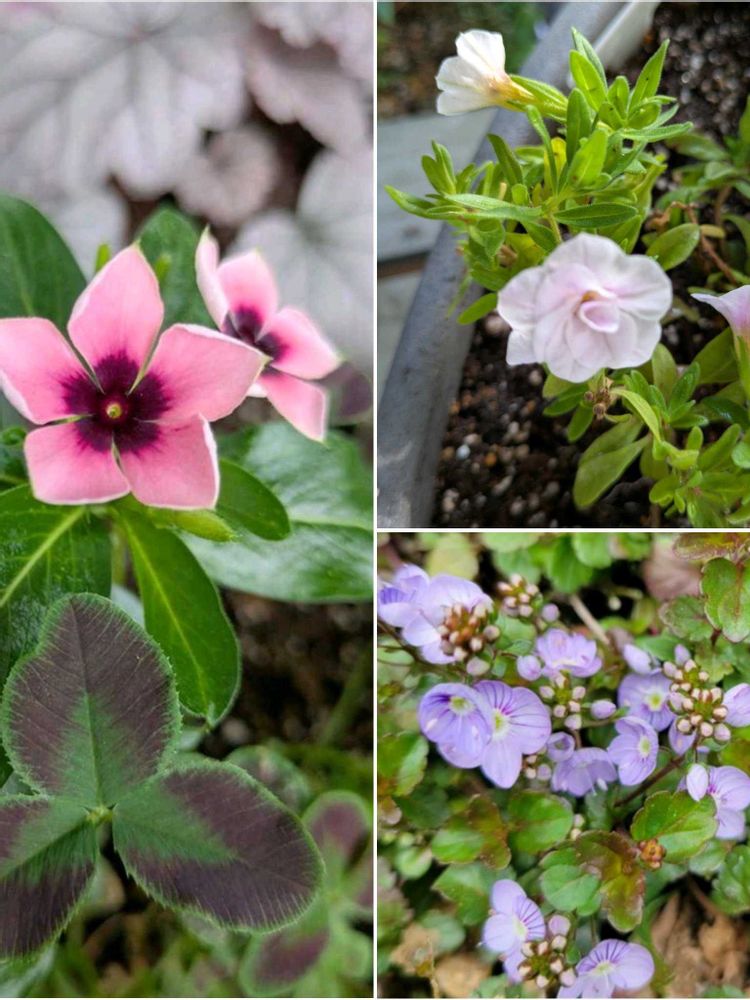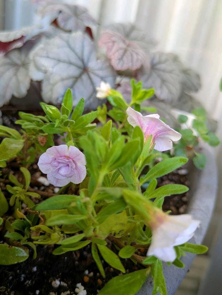 ホムセンの見切品コーナーで半額ゲット。状態はそれほどわるくないです。儚げな淡い紫に惹かれました。現役ネイリストさんが育種したゲブラナガトヨさんの品種だそう。先日ゲットしたカリブラコア ロマンスと同じシリーズかな? 2枚め写真のヒューケラ シルバーガムシロップ、黒葉クローバー、ビンカ モネ、ベロニカマダムマルシアと寄せ植えしました。3、4枚め写真はお借りした写真で白からラベンダーまで色幅がでるみたいですね。