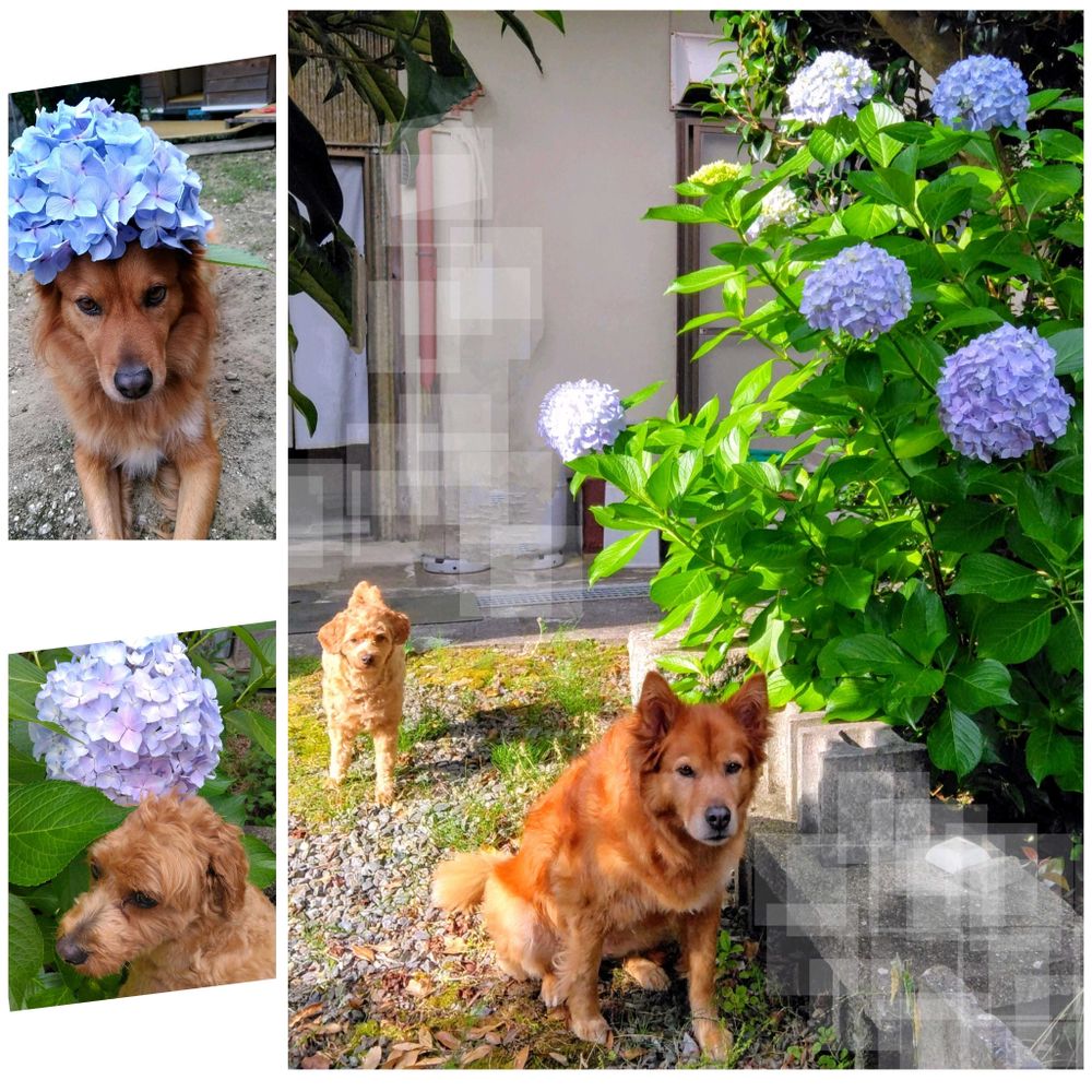 あらꉂ🤭頭に可愛い紫陽花冠つけてもらったのね🐶🐶