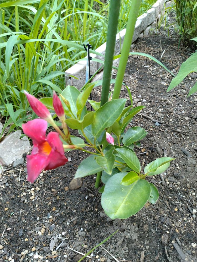 昨年末、学校花壇の隅に植えてあったマンデビラ サンパラソル。冬越しは難しい(防寒対策なし)と思ってましたが、見事、再び花が咲きました😍枯れたように見えたけど、根っこは生きてたんですね!