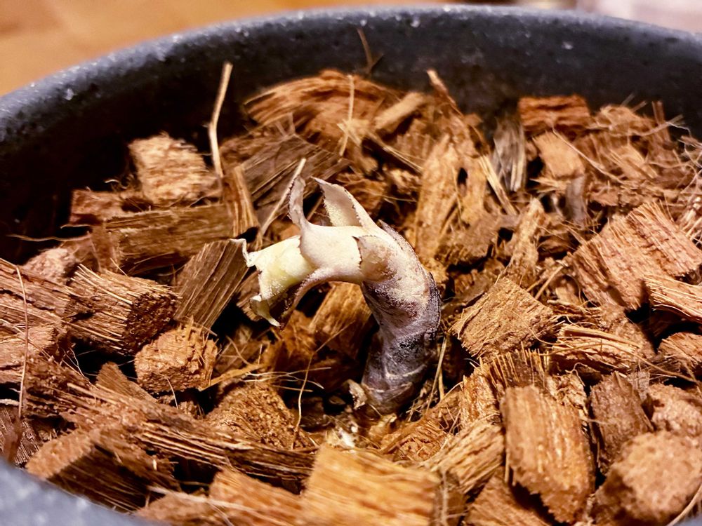 ここまで元気に生きようとして嬉しいす。ずっと土を空だと思ってた芽は縞模様からかけ離れた色白😆♡