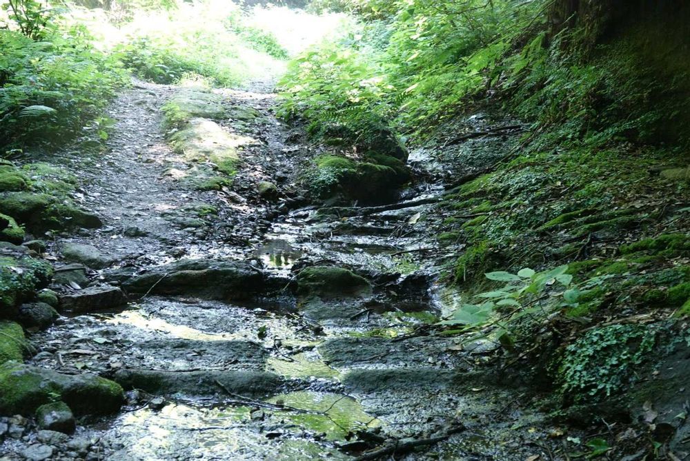 岩盤の峠道は常に水が滲み出ている(5枚目)ので靴には要注意ですが、割と安易な古道。