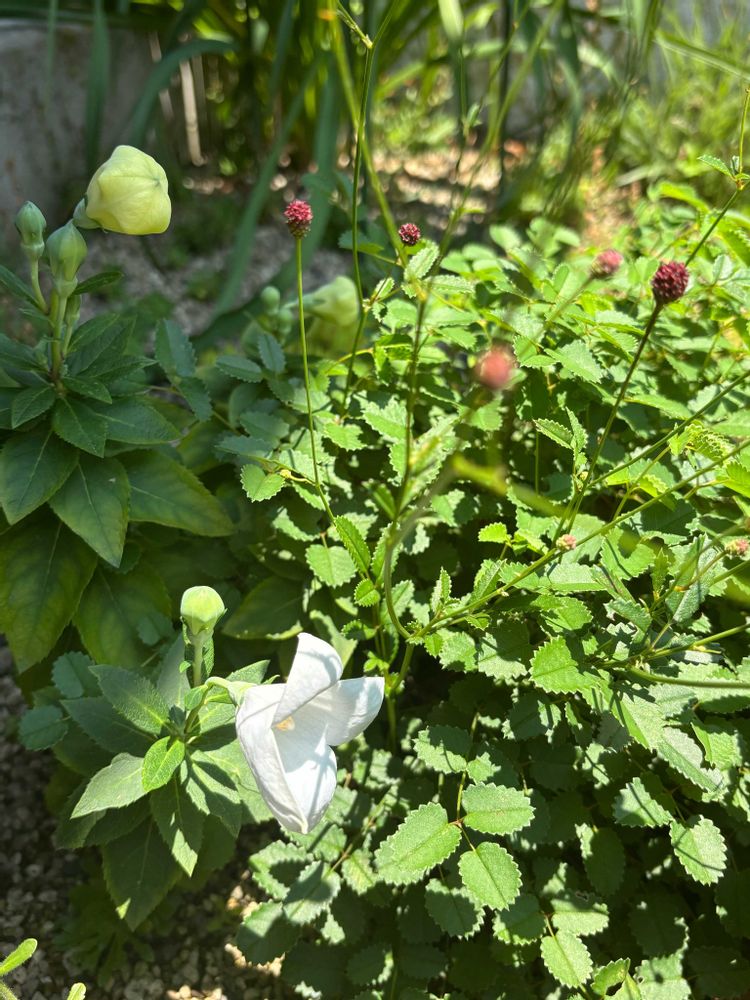 白い桔梗(キキョウ)が咲き始めました。ヒメワレモコウと並んで咲いています。