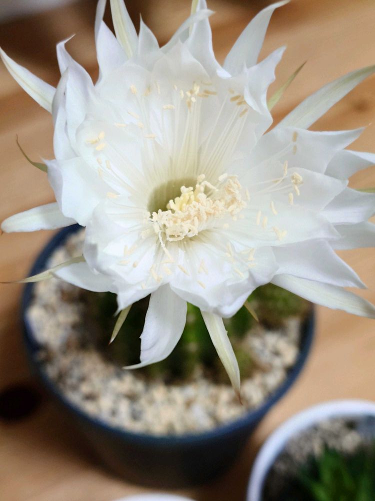 さん。咲いたね。わが家のサボテンは、次の日14時頃まで咲いてました。8時〜夜中2時まで観察。それから寝て朝見たらまだキレイに咲いてて夜更かしして見なくても良かった。