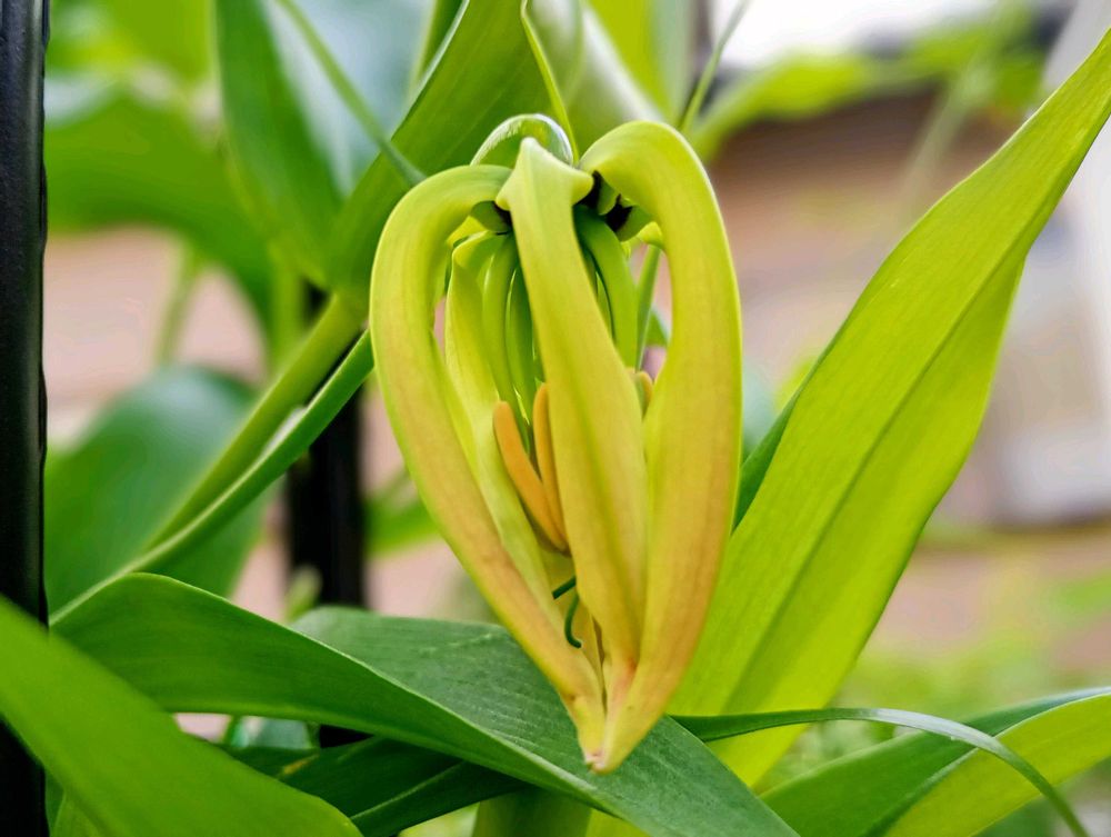 ✤🍀花友さんに頂いた、グロリオサの蕾に💛色が出てきました🥰大っきな植木鉢にラティス。もう1.5mを超えそうです