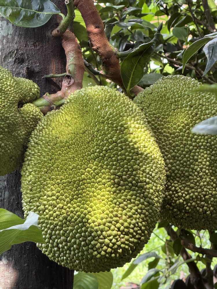 この公園のジャックフルーツの木はまだ細めで、わりと背も低いんだけど、立派な実ができてます〜👀👀😲
