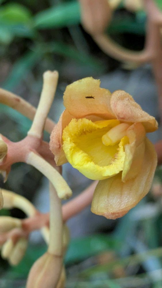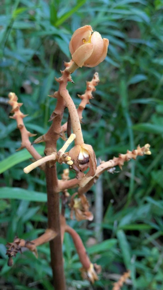 ナラタケ菌と共生する野生ランで、ギンリョウソウと同じく葉緑素を持たない菌従属栄養植物🟡