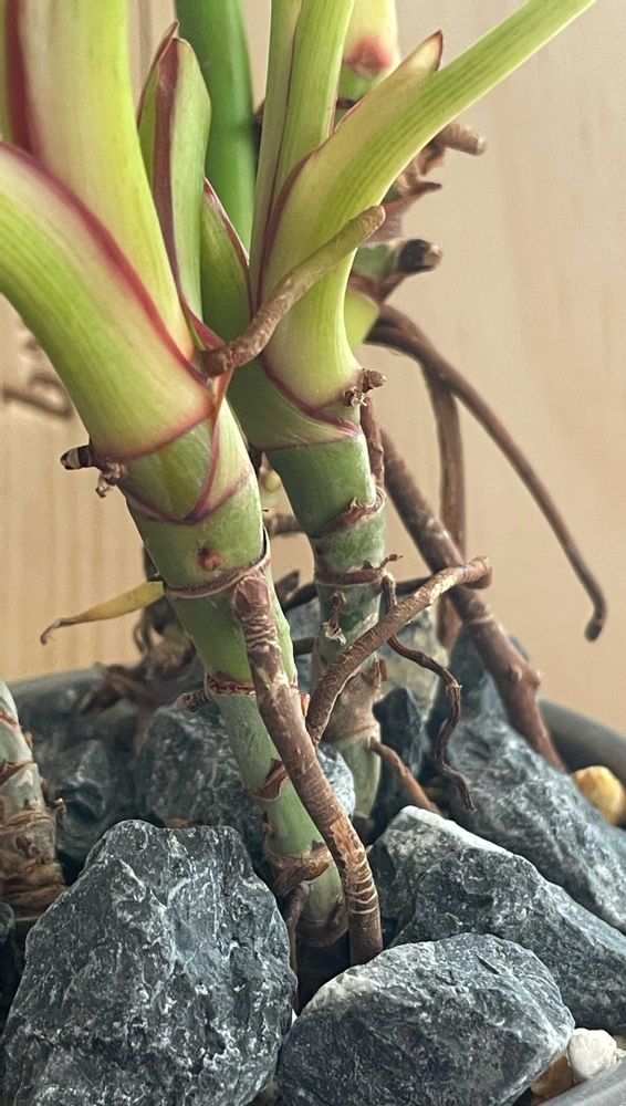 ('w')トホホ・・しかも前に投稿したオバケの白葉やはり3枚ほど枯れてしまった。斑が無い葉っぱと根っこも少し落として脇から出てる根っこは みんな切ってしまうのだろうか、まぁそれは土に誘導してかなりの鉢下げ⤵⤵した。こんな仕立てでよかろうもんか、('・(・)/