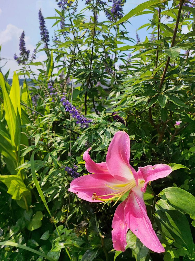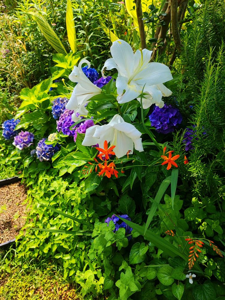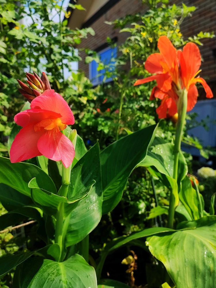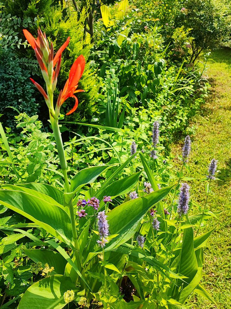 本日の庭。カンナがどんどん咲いてきています。矮性のピンクと赤、細い赤は原種のダンドクです。ピンクのOTユリ プーケット開花。私の好きなヒメヒオウギスイセン(クロコスミア)が咲き始めました。夏だねぇ…