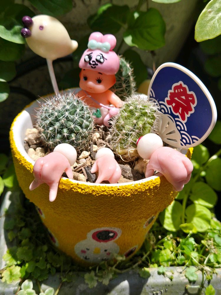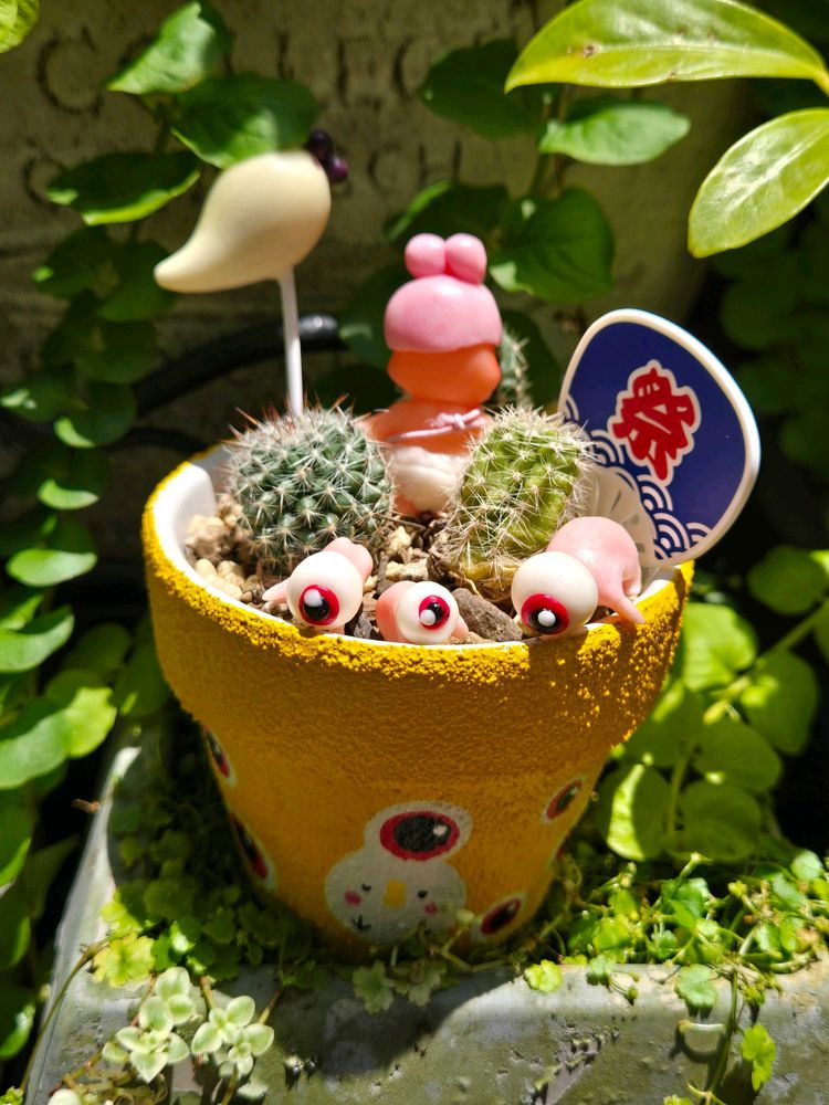 KOHちゃんのオヤジピータン鉢まだ何植えようか決まってなかったけど、オヤジフェスティバルなので投稿したいな~と取り敢えずミニサボ🌵ちゃん植え👻ゴーストュータンと月の雫さんのオヤジピータン添えてみました😆
