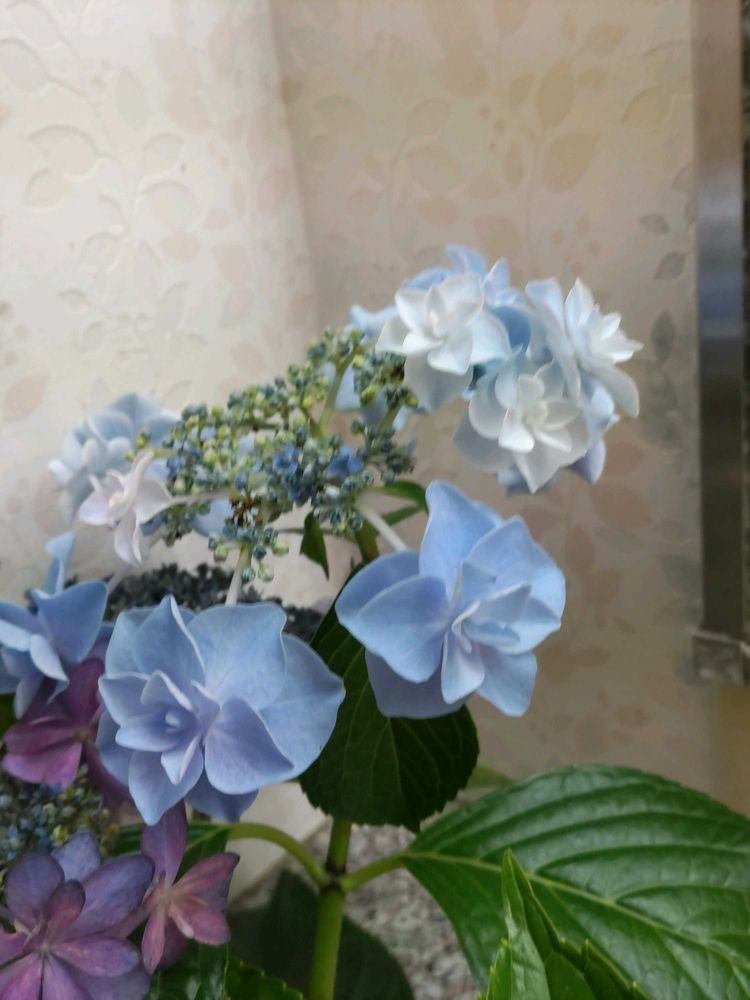 いつもの隣市の温泉に行きましたら、駐車場の紫陽花、化粧洗面台の側に、わが家にはない品種の紫陽花が、色紙のような、水色🩵💙の花びらが綺麗でした💓又、受付横には、いつも立派な胡蝶蘭が飾って有ります。待合室のテ―ブルにもミニ胡蝶蘭が飾って有り、花にも癒されますね。雨の季節の紫陽花がもう少し見られれば良いのに、あまりにも、短かった梅雨時でしたね!