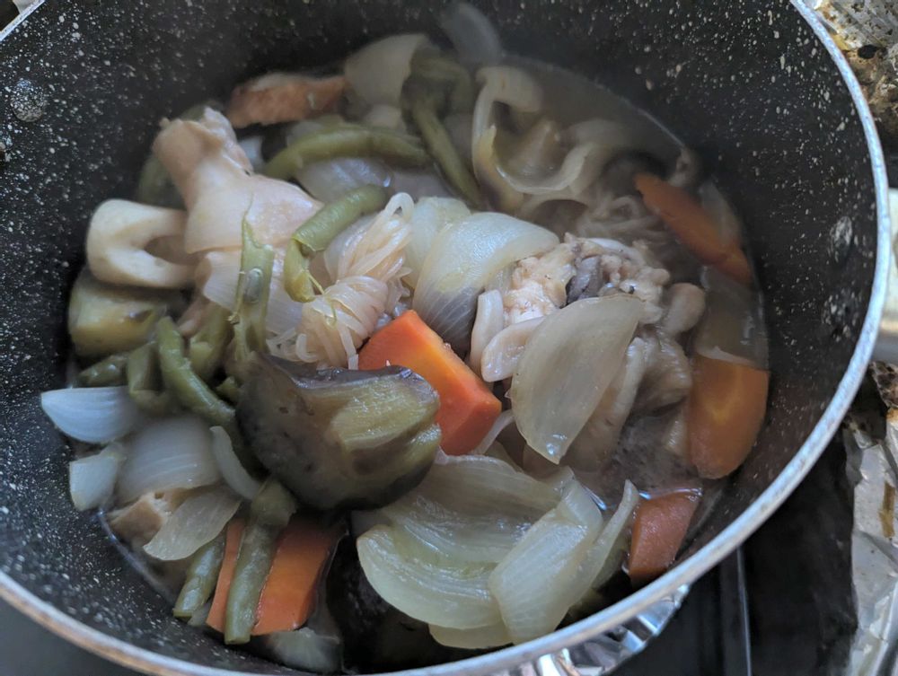 6月最後の今夜の一品、自給自足の煮物🍆🥕🧅🍄🟫いんげん豆、厚揚げ、竹輪、糸こん〜今から畑の夏野菜に水やりしてから頂きます〜気温33度、暑いよ💦🎐🎐🎐