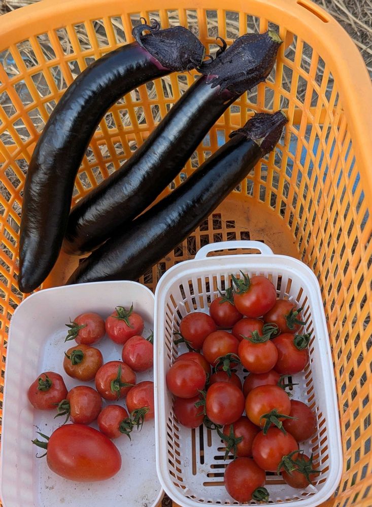 今日の収穫、ミニトマトは赤い実が増えてきました。