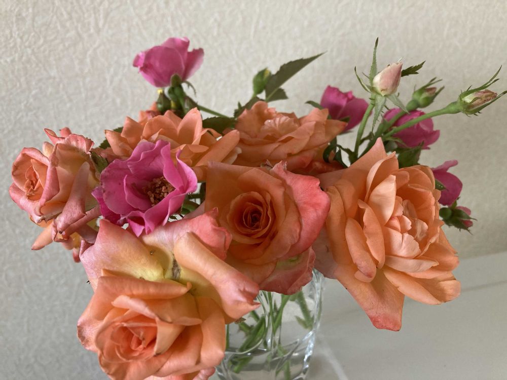 ①春の半分程の大きさで咲き始めたバラを、ガラスの空き瓶に挿して楽しむ事に…(雑😹)