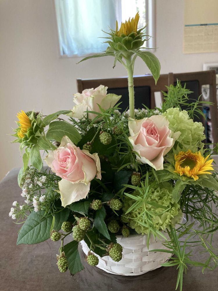 一緒にレッスンを受けて夏のイメージの向日葵🌻🌻🌻とバラを上手に生けてくれました🌹緑色の葉っぱも足元にあしらって͛.*🍃涼しげなアレンジメントに仕上がりました😊