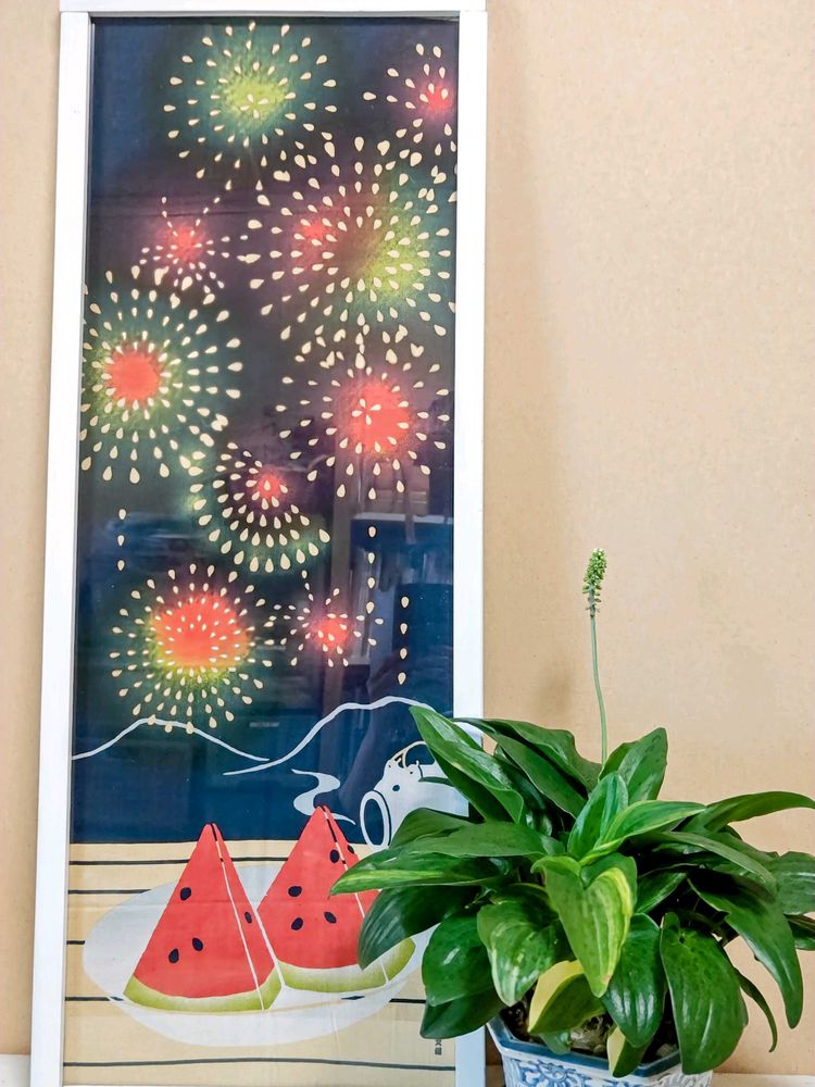 絵手ぬぐいを、紫陽花から花火とスイカ🍉に替えました。いよいよ夏本番。