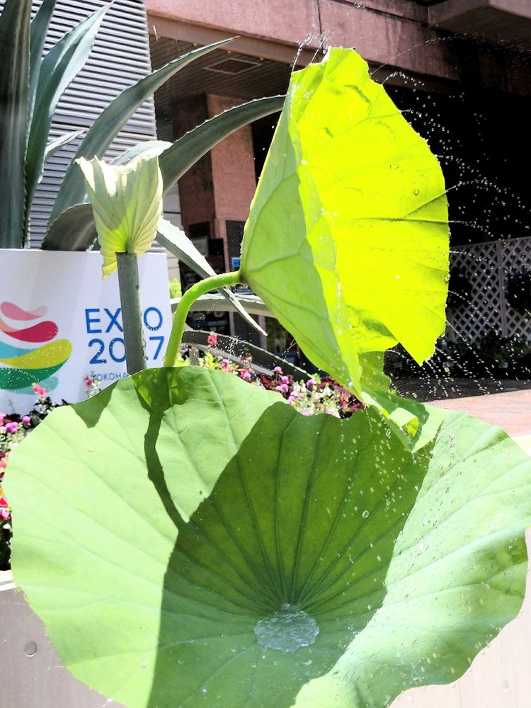 市役所の前に鉢に植わったハスが,そろそろ並びます🎵