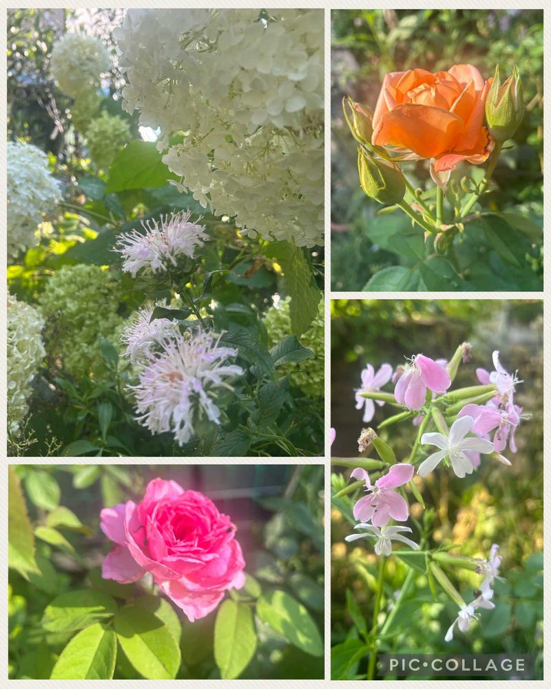 7月初日の今朝の庭☀️〜 アナベルに飲み込まれてしまいそうなモナルダ とソープワートと薔薇